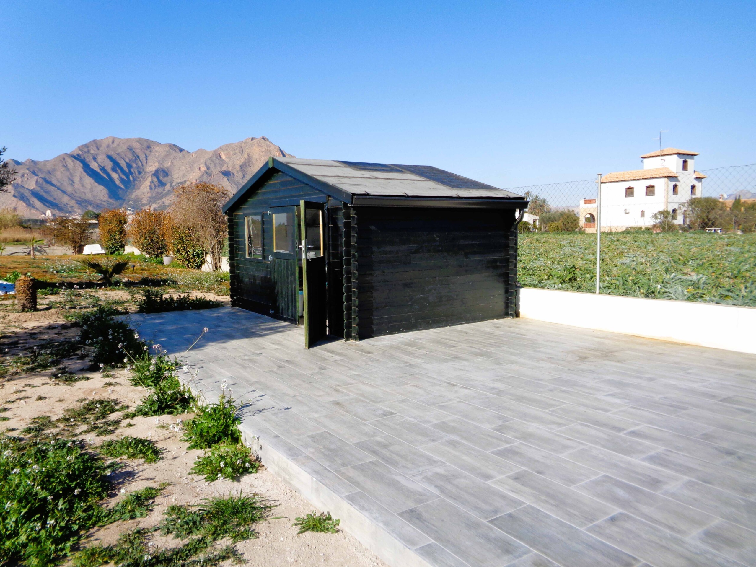 Terraza lateral cubierta y cobertizo, perfectos como zona de ocio o almacenaje